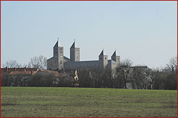 Die monumentale Abteikirche mit ihren vier wuchtigen Türmen beherrscht weithin die Landschaft am Main und zeigt, wie die Neigung zur riesenhaften Form auch den katholischen Kirchenbau der 30er Jahre beeinflusste. Der Bau ist von den Formen der Romanik geprägt und weist nur wenig bauplastische Zier auf. Über dem Hauptportal, das von Figuren der vier Evangelisten geschmückt wird, öffnet sich eine große Rosette ins Kirchenschiff. Im Inneren beeindrucken vor allem die gewaltigen Dimensionen. Die meisten Austattungsstücke sind von den Kunstwerkstätten der Abtei geschaffen, wie die Madonna von Br. Franz Blaser oder der Hoch-altarkruzifixus von Br. Valen-tin Kraus. Das im Kloster eingerichtete Missionsmuseum informiert über die vielfältigen Aufgaben des Ordens vor allem in Schwarzafrika, zeigt daneben aber auch eine kleine, interessante Ausstellung zur Geschichte der Abtei. P.A.S.